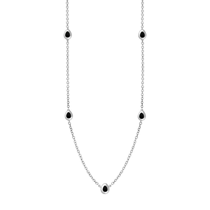 This on trend 9ct white gold chain necklace features petite discs embellished with cross shaped fine Whitby Jet stones that have been sourced directly from the North East coast of Yorkshire.