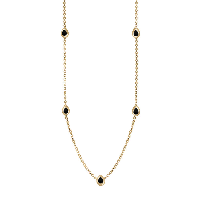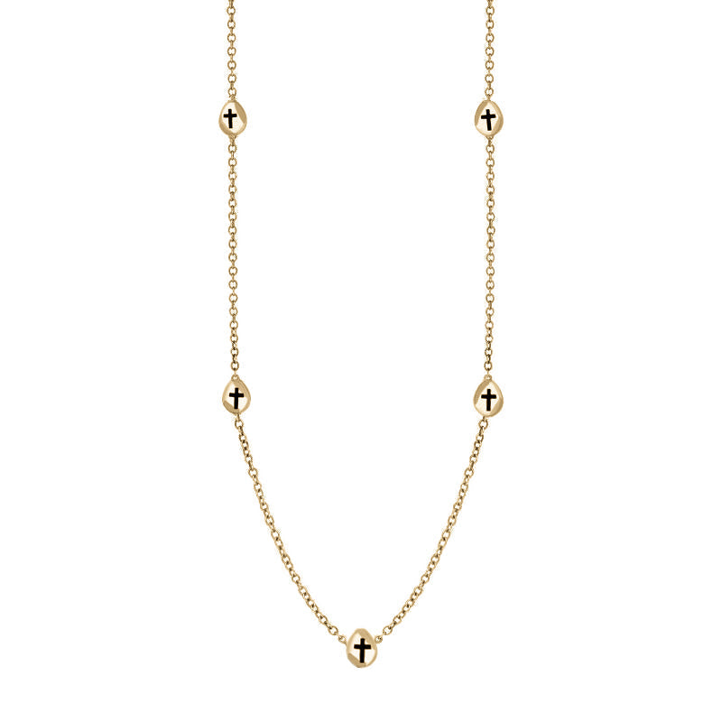 This on trend 9ct yellow gold chain necklace features petite discs embellished with cross shaped fine Whitby Jet stones that have been sourced directly from the North East coast of Yorkshire.