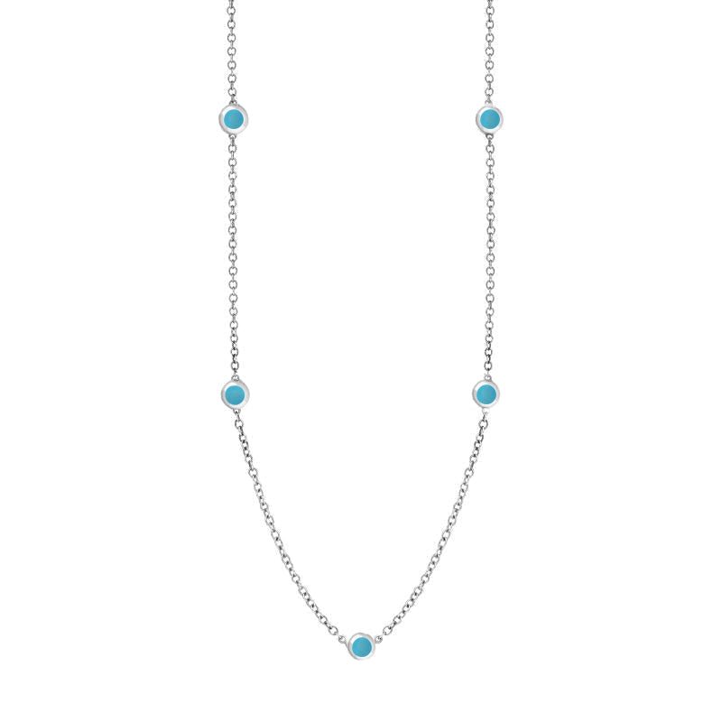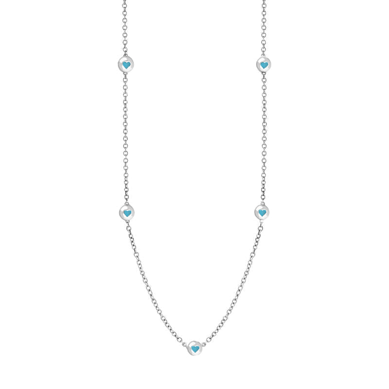 This on trend sterling silver chain necklace features petite discs embellished with heart shaped fine Turquoise stones that have been sourced directly from the North East coast of Yorkshire.