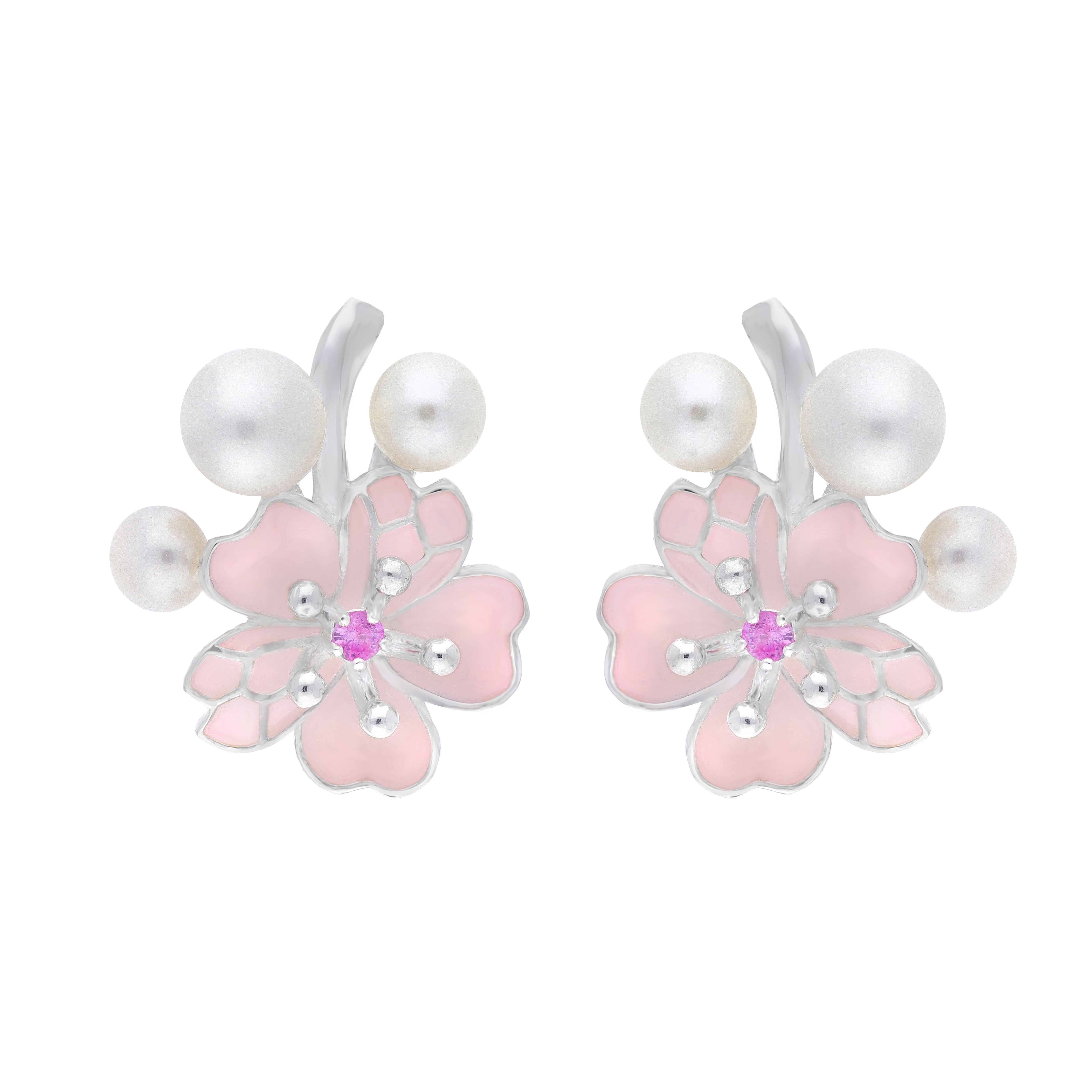 Sterling Silver Pearl and Pink Sapphire Cherry Blossom Stud Earrings