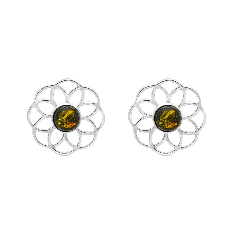These charming sterling silver earrings feature the finest Baltic Amber. The stunning Baltic Amber sits delicately in the middle of a beautiful geometric flower design. Perfect for any nature lover.