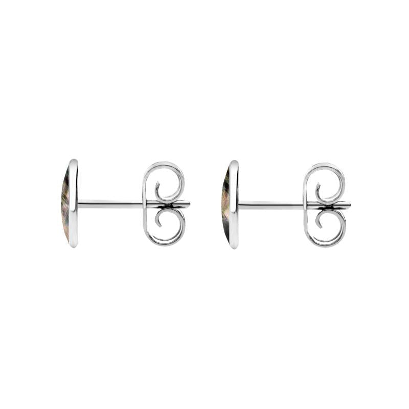 An embodiment of classic style, these sterling silver earrings feature two hand-carved circular cabochons of the finest Dark Mother of Pearl stone. The Dark Mother of Pearl is elegantly framed in sterling silver and the earrings are completed with secure post and butterfly fastenings, making them perfect for everyday wear.