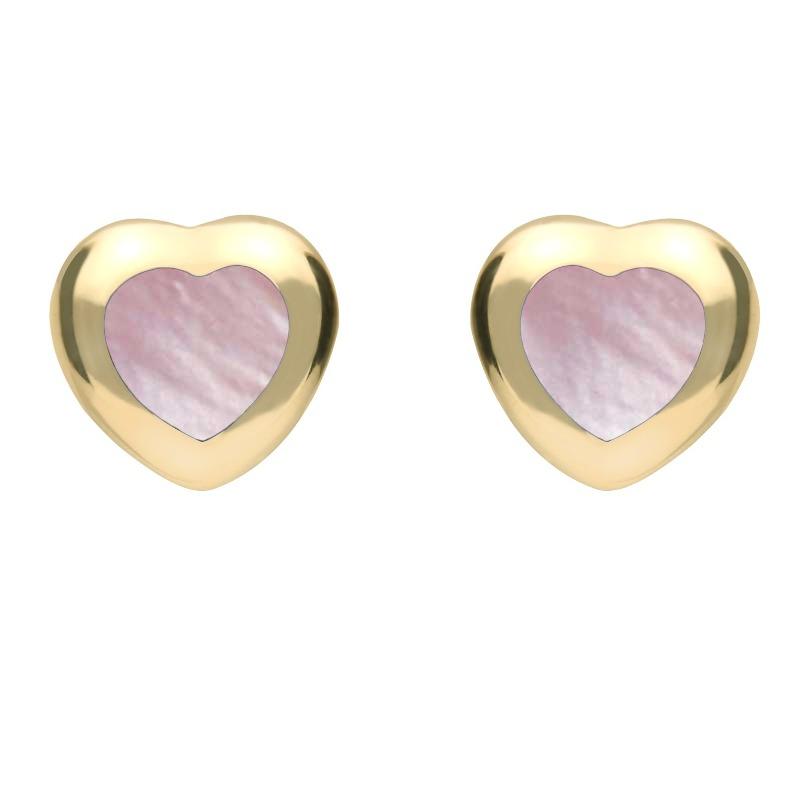These romantic stud earrings feature beautiful heart shaped cabochons of lustrous pink Mother of Pearl framed in 9ct yellow gold and highly polished for a smooth, contemporary finish. Completed with secure 9ct yellow gold post and butterfly fittings.