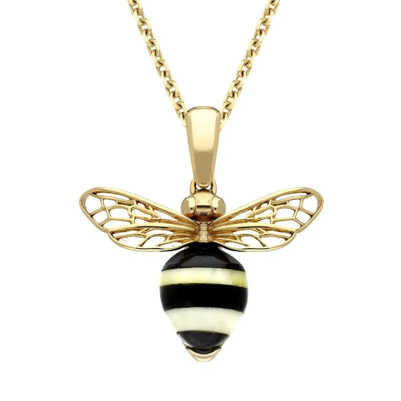 9ct Yellow Gold Whitby Jet Amber Winged Bee Necklace, P3341