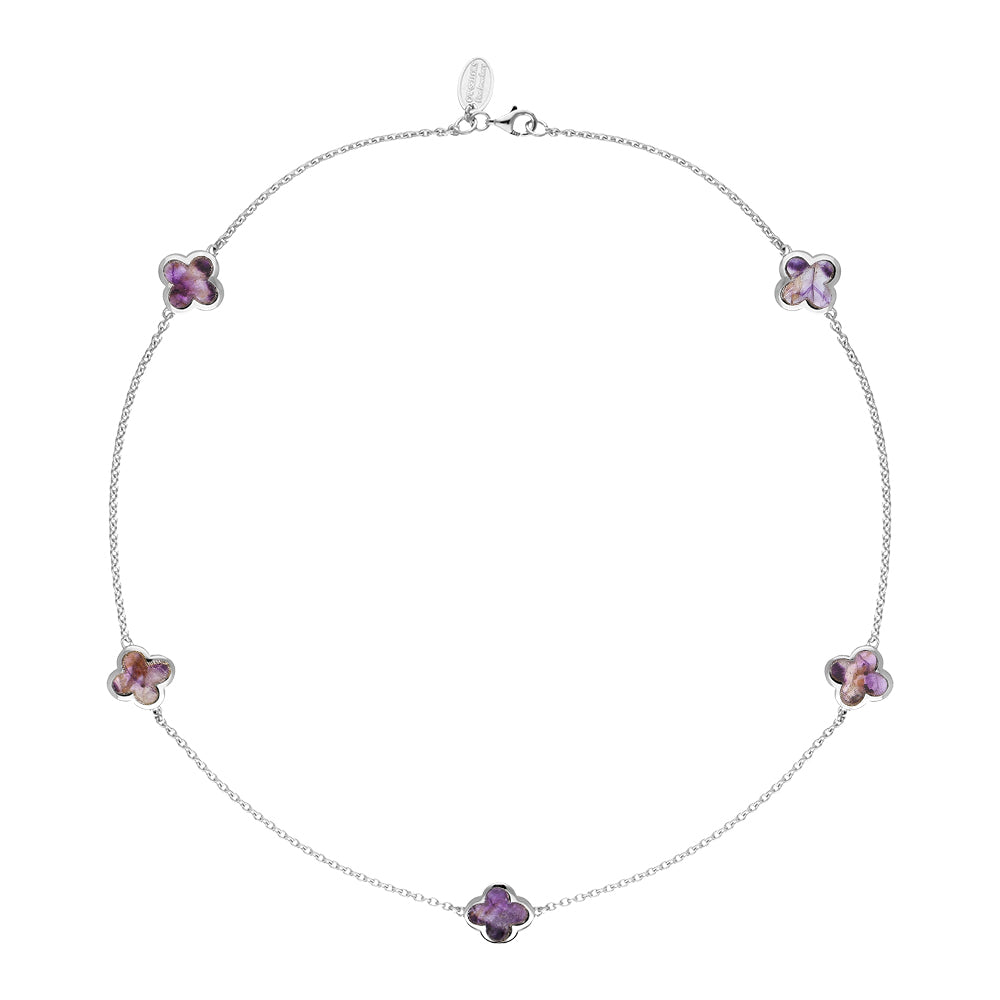 This elegant necklace features five stunning four leaf clover shaped cabochons of the finest Blue John stone, that has been sourced directly from the Derbyshire Blue John Cavern in Castleton. The striking Blue John forms a stunning contrast between the sterling silver chain, creating the perfect look for every occasion.