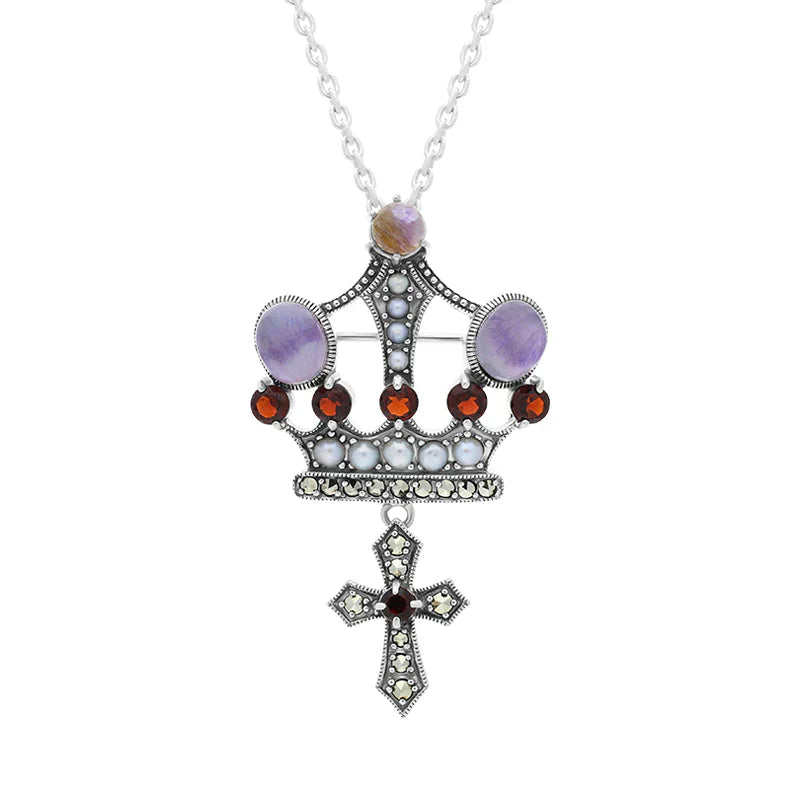 Sterling Silver Blue John Marcasite Garnet Freshwater Pearl Crown & Cross Necklace