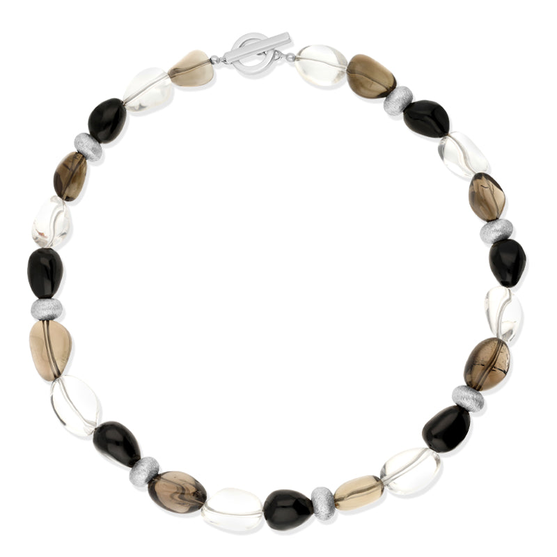 This unique necklace features genuine Whitby Jet, clear Quartz and Smokey Quartz beads. Perfect for day to evening wear, the necklace is completed with a sterling silver t-bar clasp and decorative silver beads. Length: 18 inches.