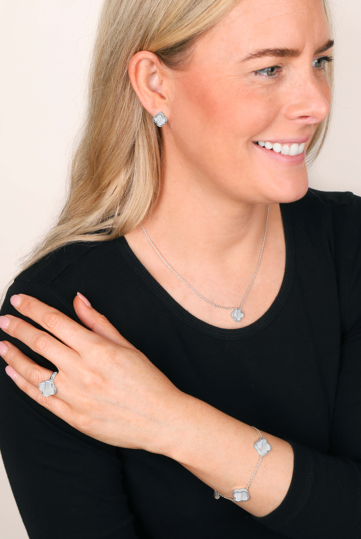 This elegant necklace features a stunning four leaf clover shaped cabochon of the finest Mother of Pearl. The clover is surrounded by a ball edge detail for a unique, stylish finish. The striking Mother of Pearl forms a stunning combination with the 18ct white gold ball frame, creating the perfect look for every occasion. Presented on an 18 inch long chain.