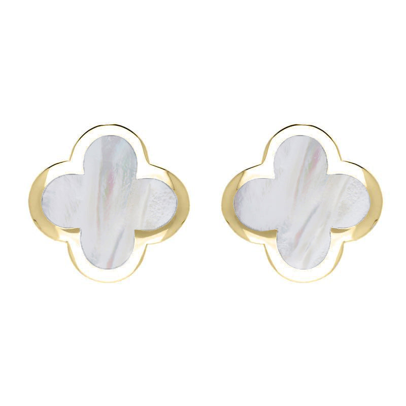 9ct Yellow Gold White Mother of Pearl Bloom Four Leaf Clover Stud Earrings, E2465