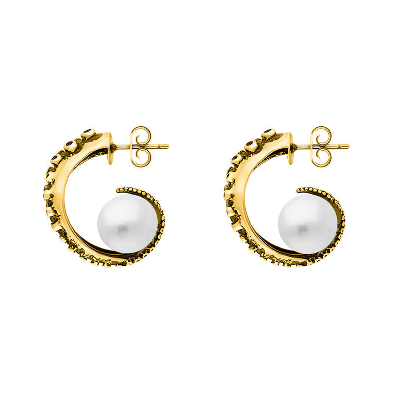 Discover our beautifully crafted Sea Life collection and add to it with these 18ct yellow gold and freshwater pearl tentacle hoop earrings. Our items make the perfect gift and become treasured memories for years to come. These hoop earrings resemble a three-dimensional swirling tentacle, featuring 18ct yellow gold sucker detail holding a freshwater pearl bead. This item comes complete with 18ct yellow gold post and butterfly fastenings.