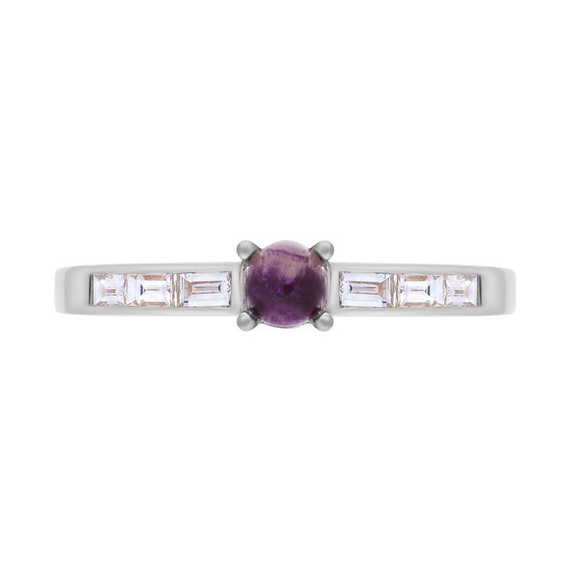 This unique 18ct white gold ring features a stunning hand carved cabochon of the finest round Blue John stone measuring approximately 4mm in diameter, which has been sourced locally from Castleton, in the heart of the Peak District. A row of channel set baguette cut diamonds totalling 0.31cts are set either side of the beautiful Blue John stone. The perfect engagement ring featuring a rare British gemstone.