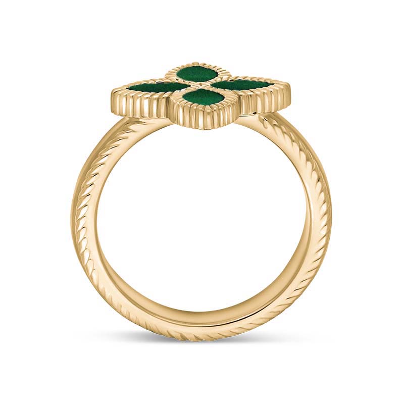 This elegant ring features four stunning marquise shaped cabochons of the finest Malachite stone in the shape of a flower, sourced directly from the north east coast of Yorkshire. The flower is surrounded with a rope edge detail for a unique, stylish finish. The striking Malachite forms a stunning contrast between the 18ct Yellow gold rope edge frame, creating the perfect look for every occasion. Presented on a polished 18ct gold shank for durable wear.