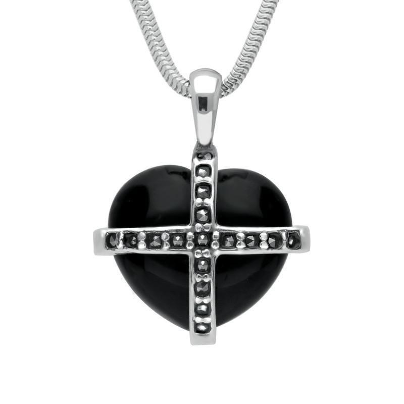 Sterling Silver Whitby Jet Seventeen Marcasite Small Cross Heart Necklace, P2265