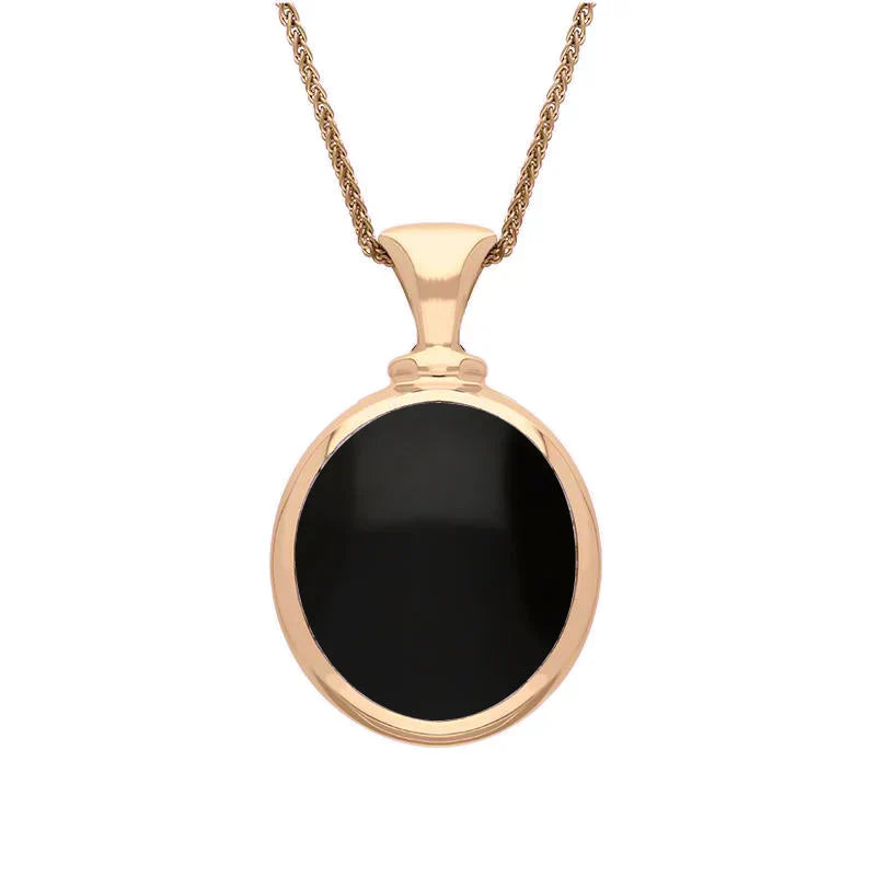 This beautiful double sided fob style necklace features the finest Whitby Jet and White Mother Of Pearl. The hand carved gemstones are flush set into the organic, contemporary oval shape giving a smooth and highly polished finish. Sold complete with an 18 inch 9ct rose gold chain which fastens with a classic bolt ring style clasp. Dimensions: 18mm x 15mm.