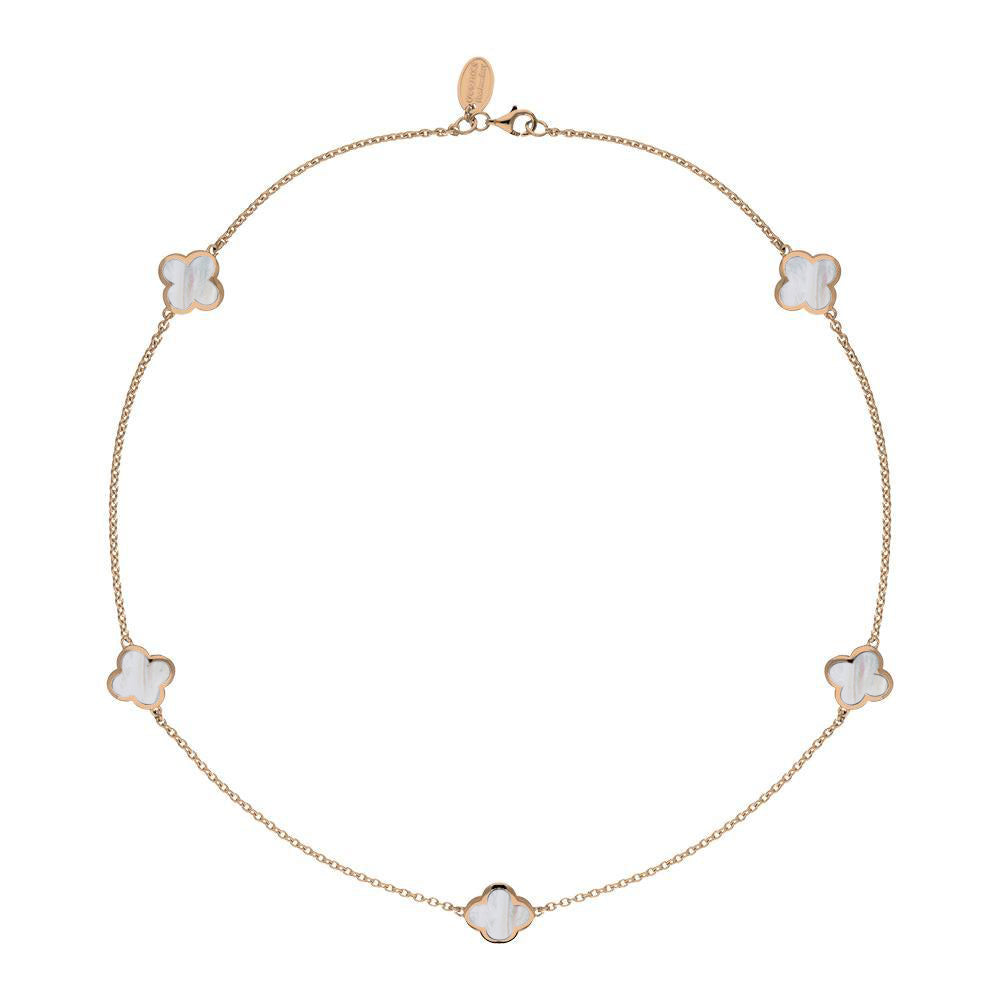This elegant necklace features five stunning four leaf clover shaped cabochons of the finest Mother of Pearl. The clover is surrounded with a smooth edge detail for a sleek finish. The striking Mother of Pearl forms a stunning combination with the 9ct rose gold as the clover hangs gracefully along a 77cm chain, the perfect look for every occasion.