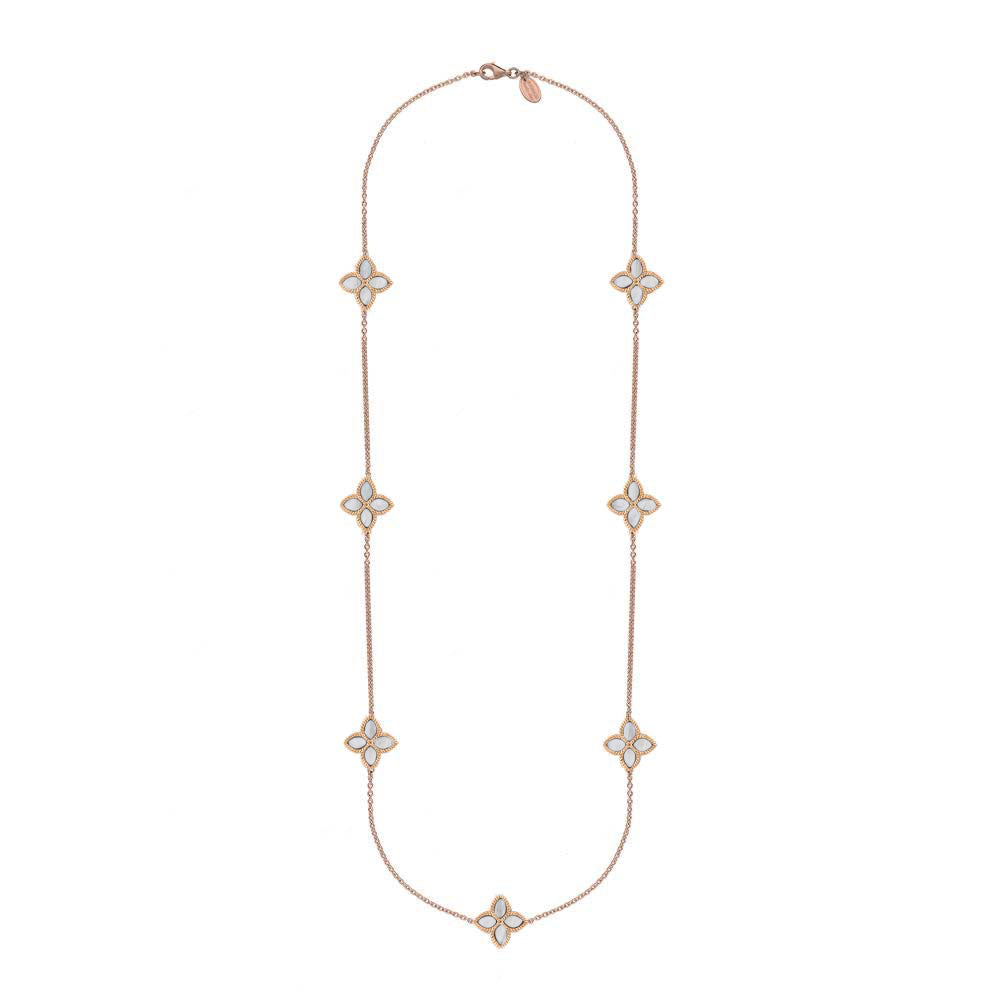 This elegant necklace features seven stunning marquise shaped cabochons of the finest Mother of Pearl. The flower is surrounded with a rope edge detail for a unique, stylish finish. The striking Mother of Pearl forms a stunning combination with the 9ct rose gold rope edge frame as the flowers hang gracefully along a 77cm chain, the perfect look for every occasion.
