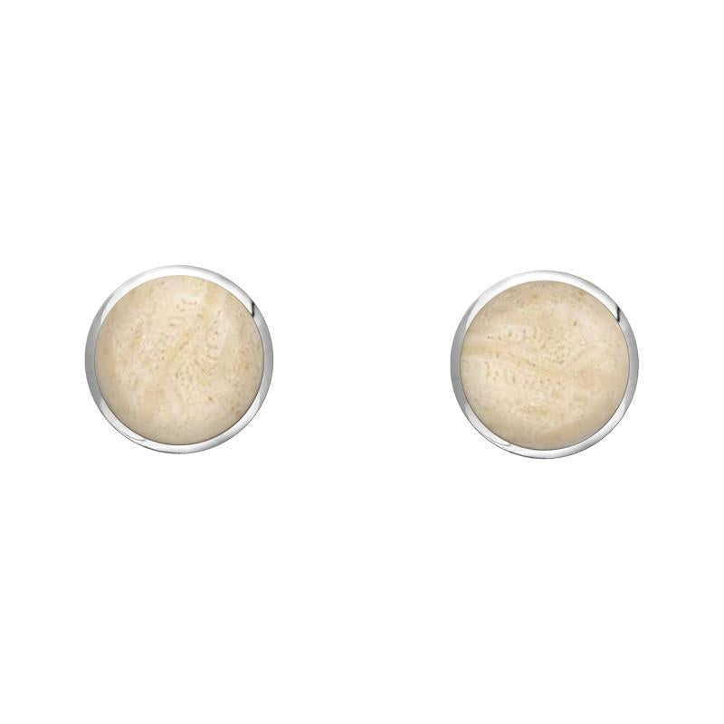 An embodiment of classic style, these sterling silver earrings feature two hand-carved circular cabochons of the finest Coquina stone. The Coquina is elegantly framed in sterling silver and the earrings are completed with secure post and butterfly fastenings, making them perfect for everyday wear.
