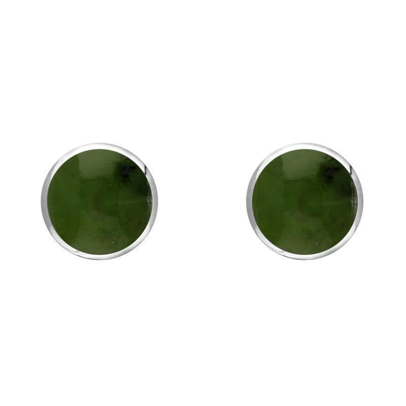 An embodiment of classic style, these sterling silver earrings feature two hand-carved circular cabochons of the finest Jade stone. The Jade is elegantly framed in sterling silver and the earrings are completed with secure post and butterfly fastenings, making them perfect for everyday wear.
