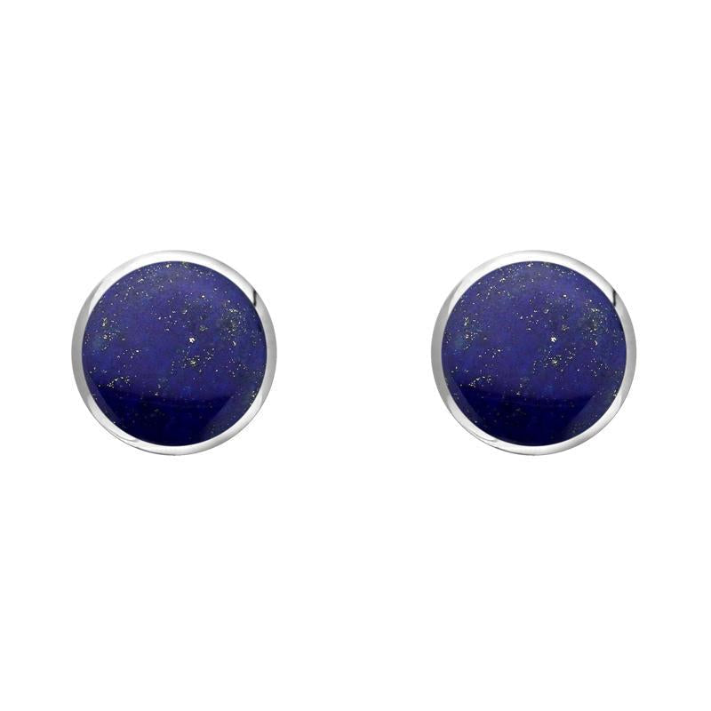 An embodiment of classic style, these sterling silver earrings feature two hand-carved circular cabochons of the finest Lapis Lazuli stone. The Lapis Lazuli is elegantly framed in sterling silver and the earrings are completed with secure post and butterfly fastenings, making them perfect for everyday wear.