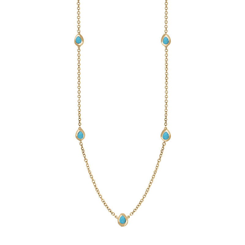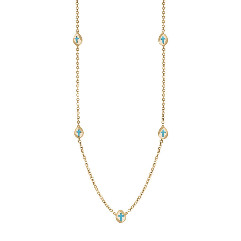 This on trend 18ct yellow gold chain necklace features petite discs embellished with cross shaped fine Turquoise stones that have been sourced directly from the North East coast of Yorkshire.