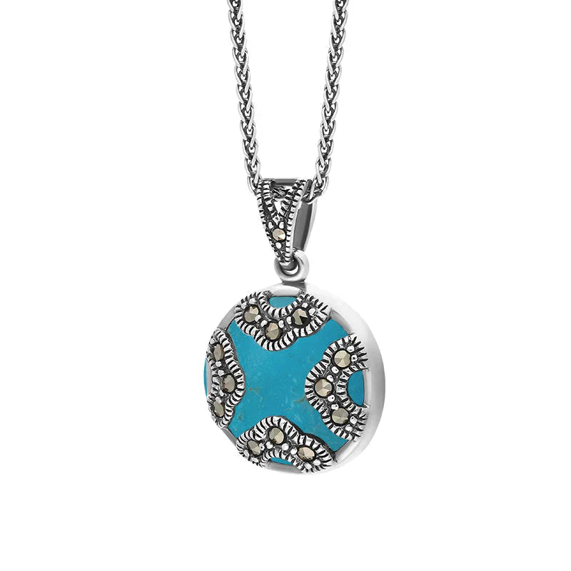 This stunning sterling silver necklace features a hand carved round Turquoise gemstone set within a detailed arced floral frame, embellished with sparkling marcasite stones. The pendant is completed with a secure 18 inch sterling silver chain.
