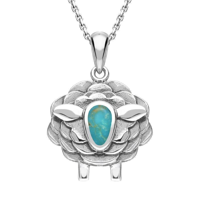This simple pendant features a beautiful sheep design, where a stunning piece of Turquoise completes the sheep face. Sold complete with an 18 inch sterling silver chain which fastens with a classic bolt ring style clasp.