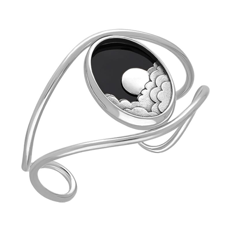 A stunning bangle features sterling silver clouds behind which a large silver moon is rising. A large hand carved Whitby Jet gemstone is set behind this beautiful design, framed with a band of silver.