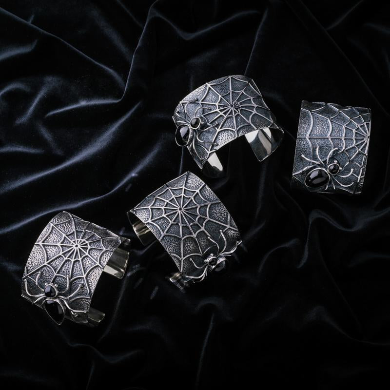 A solid sterling silver bangle featuring a finely detailed web, upon which a spider sits poised to strike. The exquisite silver workmanship has an oxidised finish which accentuates the stunning detail in this creation and highly polished Whitby Jet cabochons give the spider real presence. This is a statement cuff with a difference and a talking point for any spider or gothic jewellery lover or a collector wishing to add a unique jewellery creation to their collection.