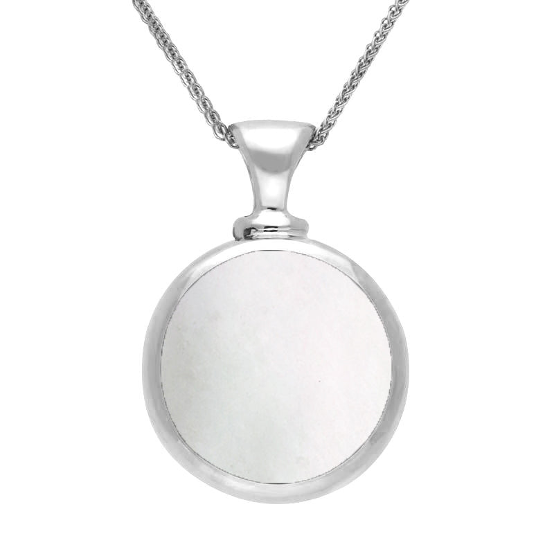 18ct White Gold Whitby Jet White Mother Of Pearl Double Sided Round Dinky Fob Necklace, P218.
