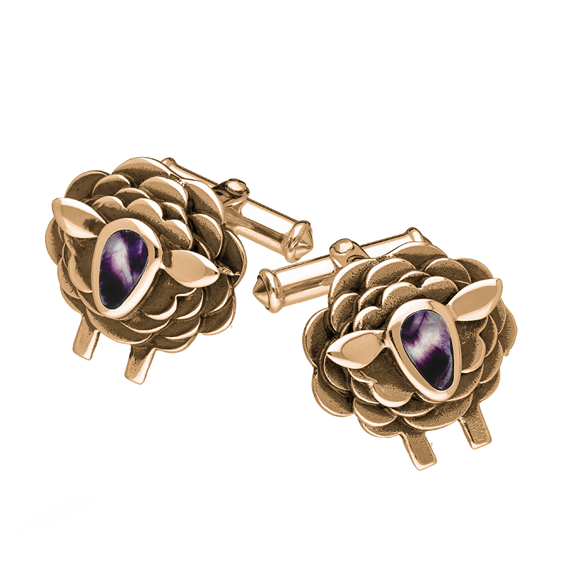 These simple cufflinks feature a beautiful sheep design, where a stunning piece of Blue John completes the sheep face on each 9ct Rose Gold cufflink.