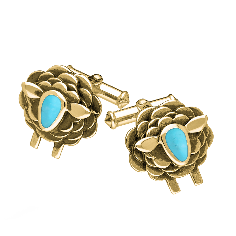 These simple cufflinks feature a beautiful sheep design, where a stunning piece of Turquoise completes the sheep face on each 9ct Yellow Gold cufflink.