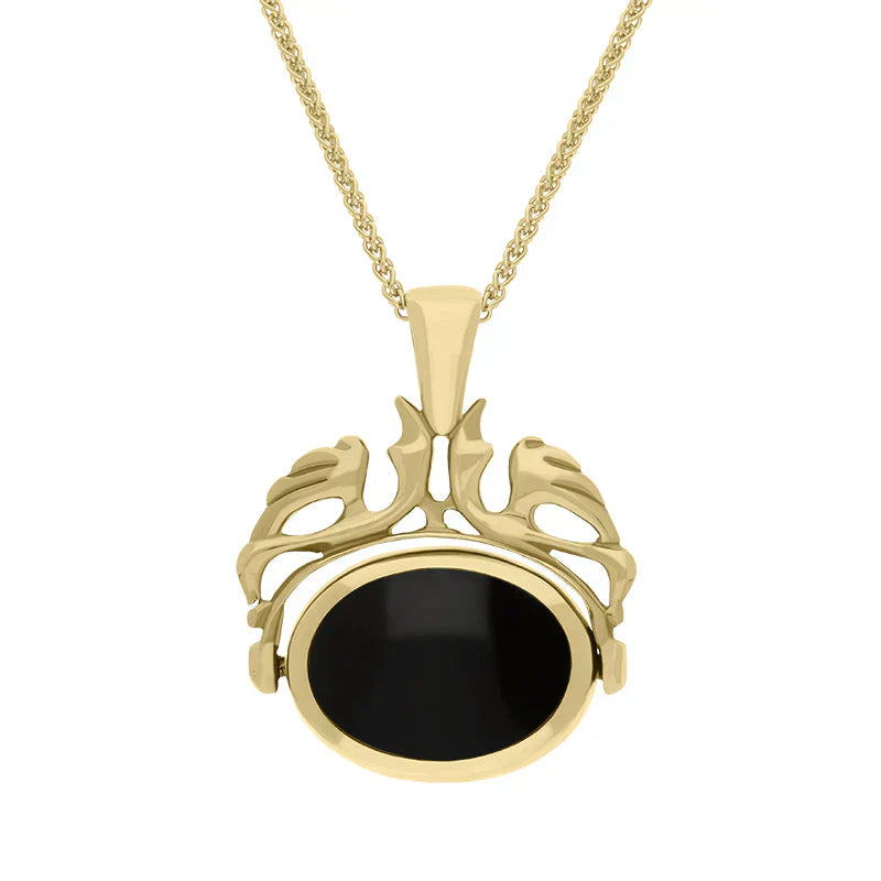 9ct Yellow Gold Whitby Jet Turquoise Double Sided Oval Swivel Fob Necklace, P104_4.