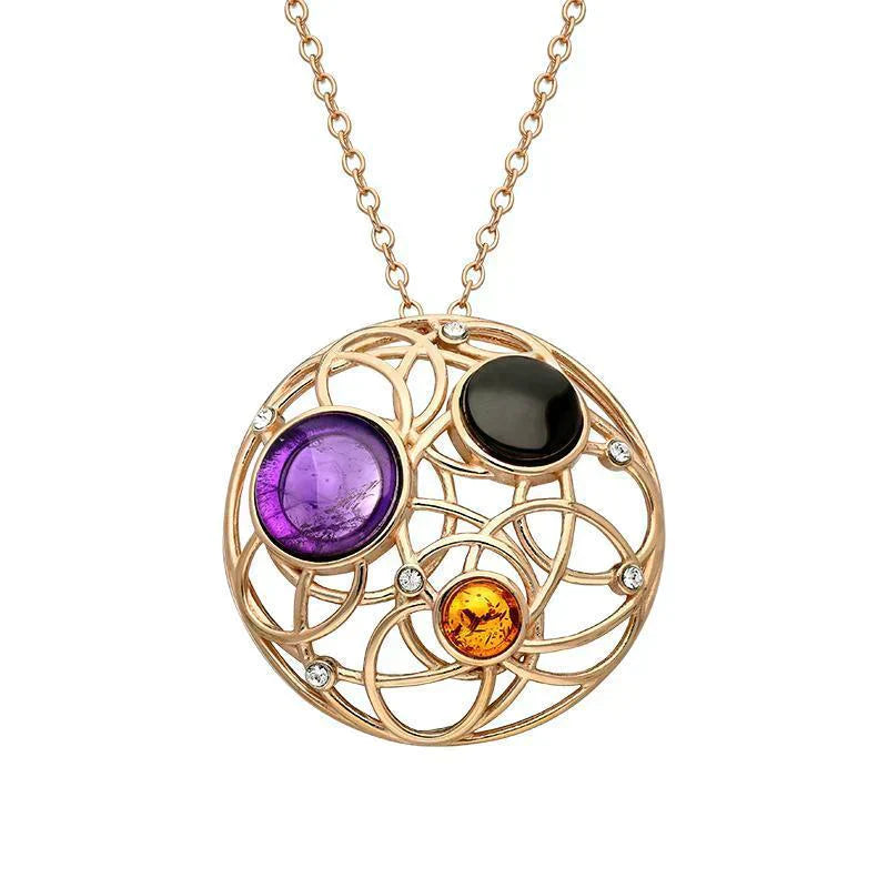 This gorgeous pendant features a rose gold plated sterling silver open circle design with a round hand carved Whitby Jet, Amethyst and Amber gemstone. An elegant and contemporary design combining three popular natural gemstones. Supplied complete with an 18 inch rose gold plated sterling silver chain.
