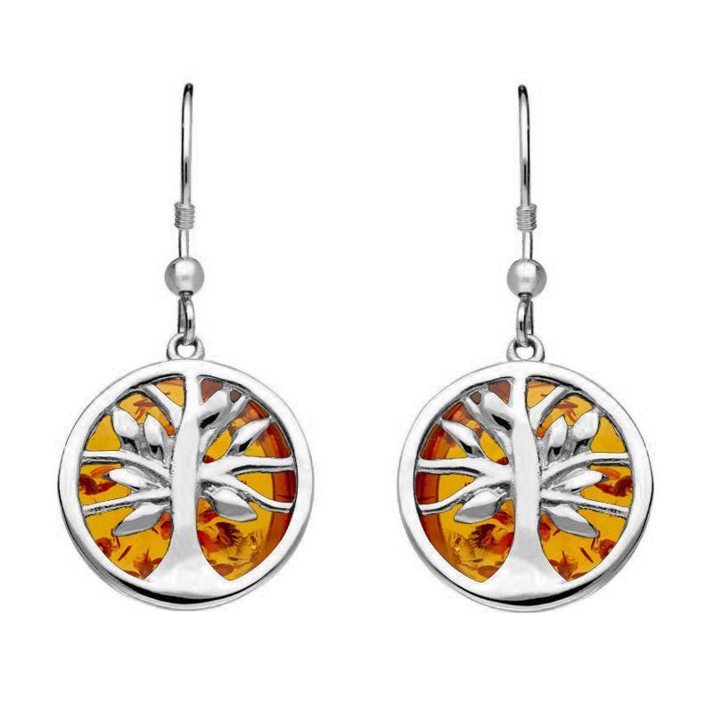 This set of elegant sterling silver and Amber Tree of Life design drop earrings are perfect for any occasion. In ancient times the Tree of Life was considered to be a symbol of immortality. The leaves on the tree were thought to have magical properties and elements to heal the soul.