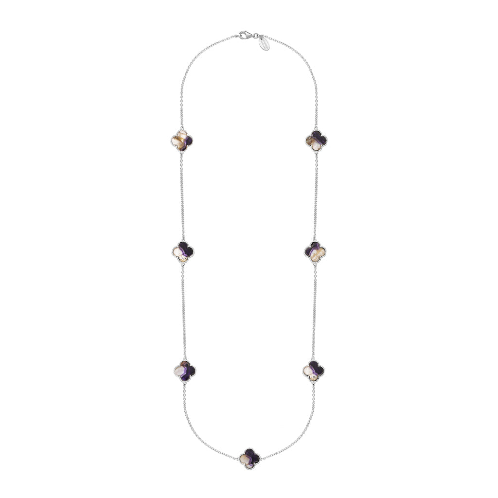 Sterling Silver Blue John Bloom Four Leaf Clover Ball Edge Long Necklace