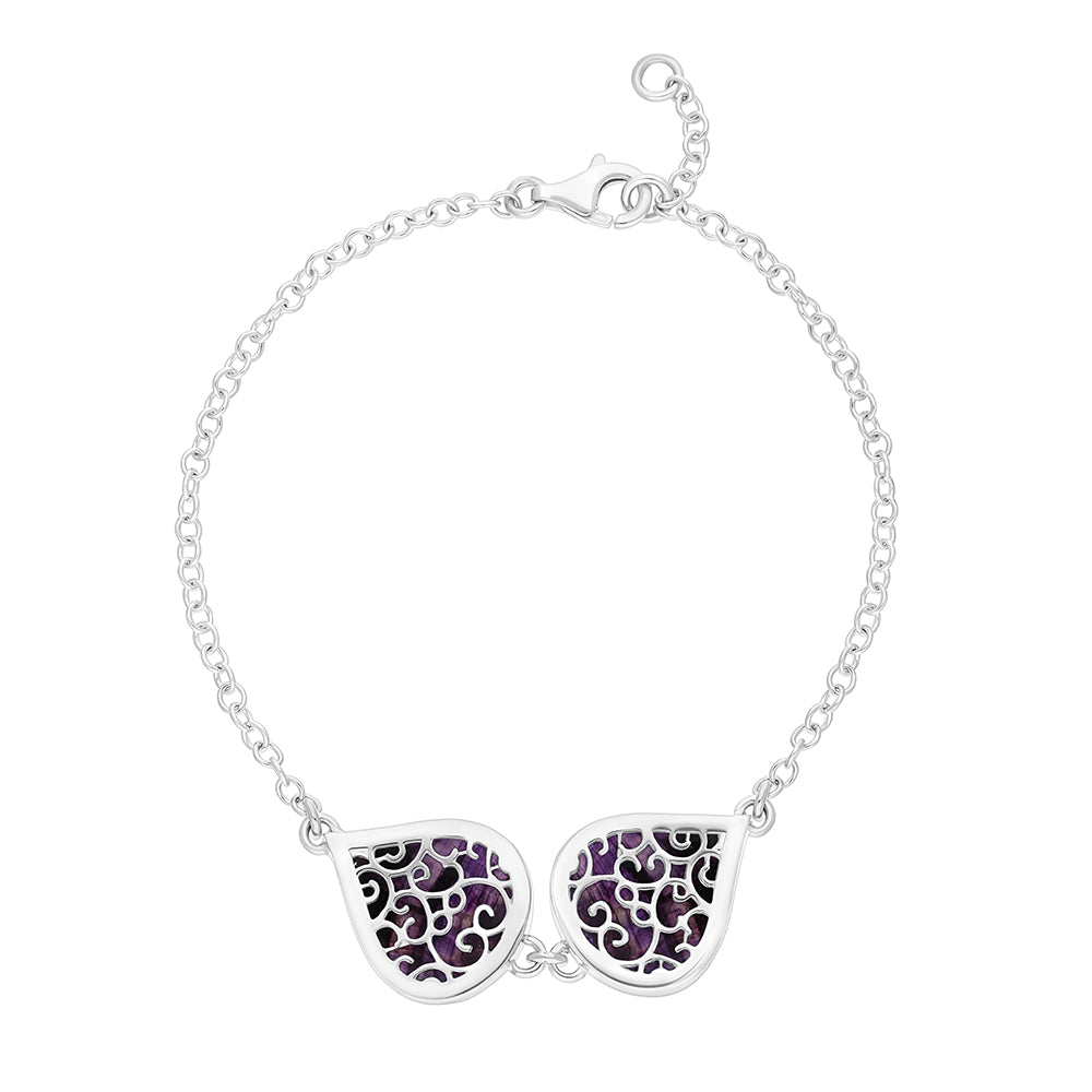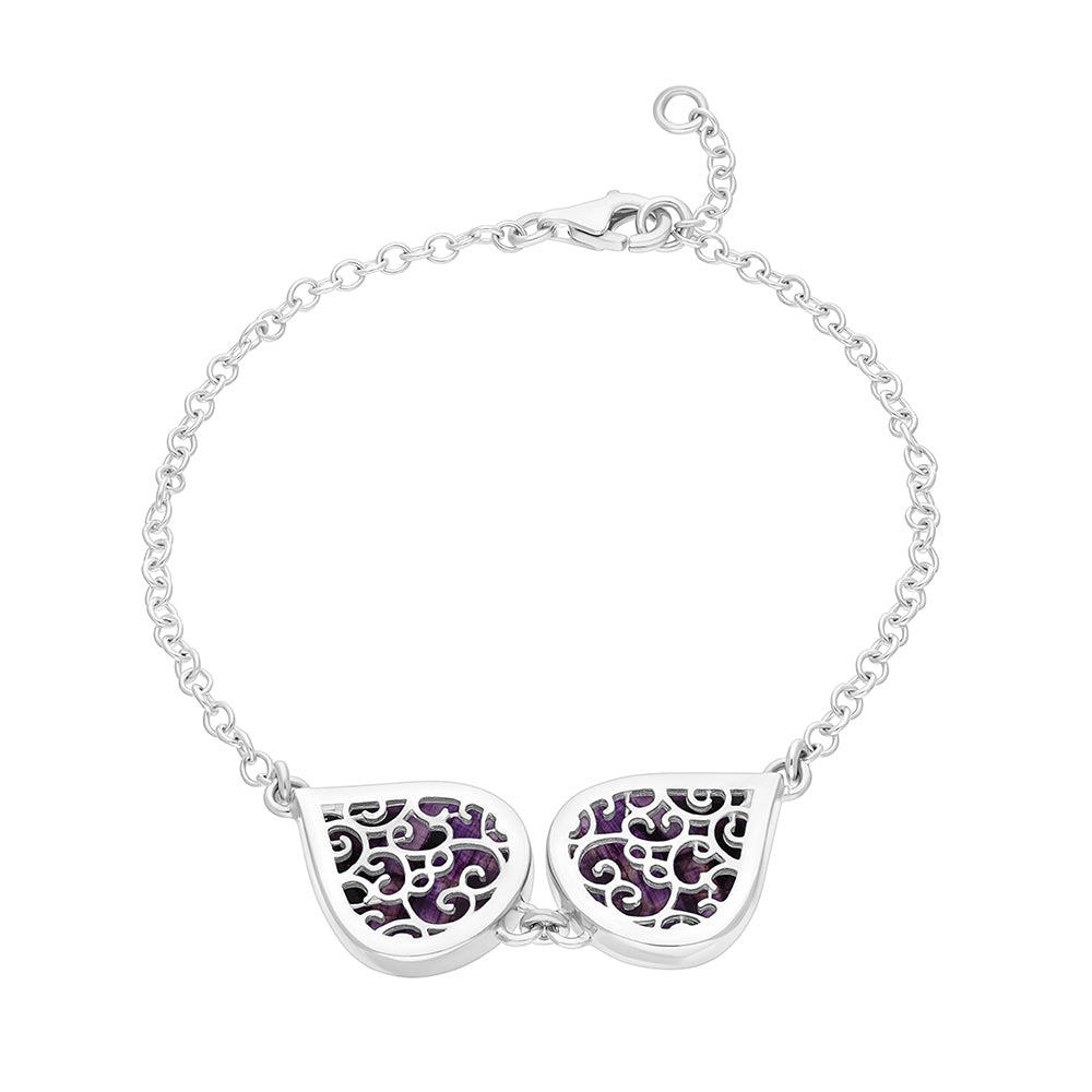 This bracelet is part of Rebecca Sellors' Flore collection, featuring two beautifully crafted teardrop-shaped cabochons of the finest Blue John stone which has been sourced locally from the the heart of Derbyshire. Encased within an intricate sterling silver filigree design, this piece has a classic chain that fastens with a lobster clasp, ensuring a secure and comfortable fit.