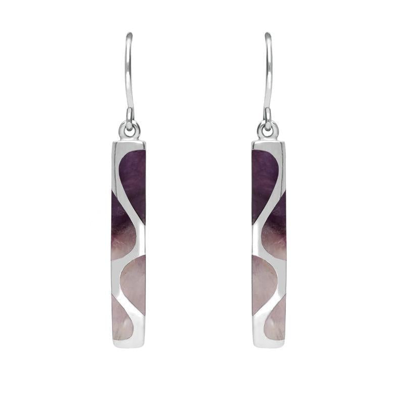These beautiful earrings have been created using a brilliant combination of solid sterling silver and the highest quality hand carved Derbyshire Blue John. The contemporary style of the earrings creates a brilliant contrast between the purple of Blue John and the bright shine of the silver creating an overall interesting and elegant piece of jewellery. Secured by a silver hook fastening. Dimensions: 41mm x 5mm.