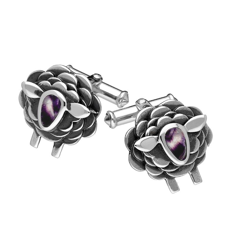 These simple cufflinks feature a beautiful sheep design, where a stunning piece of Blue John completes the sheep face on each sterling silver cufflink.