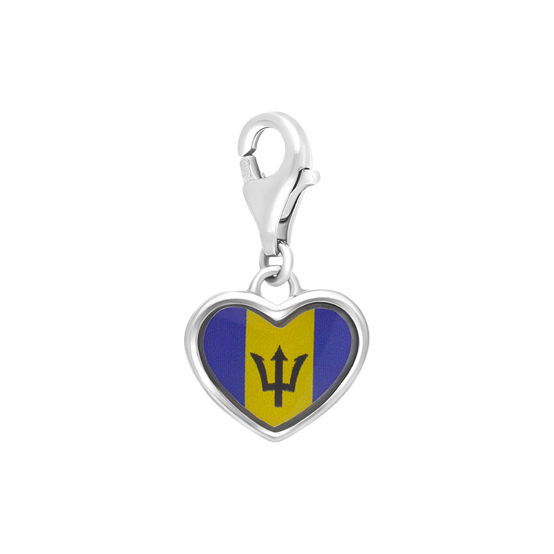 This sterling silver clip charm features hand carved Coquina and the Barbados flag on the shape of a heart. This unique charm is perfect for any avid traveller and Barbados enthusiast.