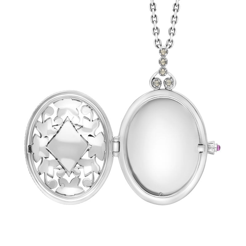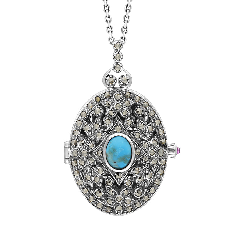 This Turquoise and Marcasite oval locket has been hand crafted within our workshops by highly skilled jewellers who use the highest quality Turquoise, sourced from North Western Arizona. The design features a central oval Turquoise gemstone surrounded by an intricate floral pattern set in Sterling Silver with sparkling Marcasite gemstones. The locket opens by a tiny hinge which allows for a photo to be placed inside. This item is supplied complete with an 18 inch silver chain.