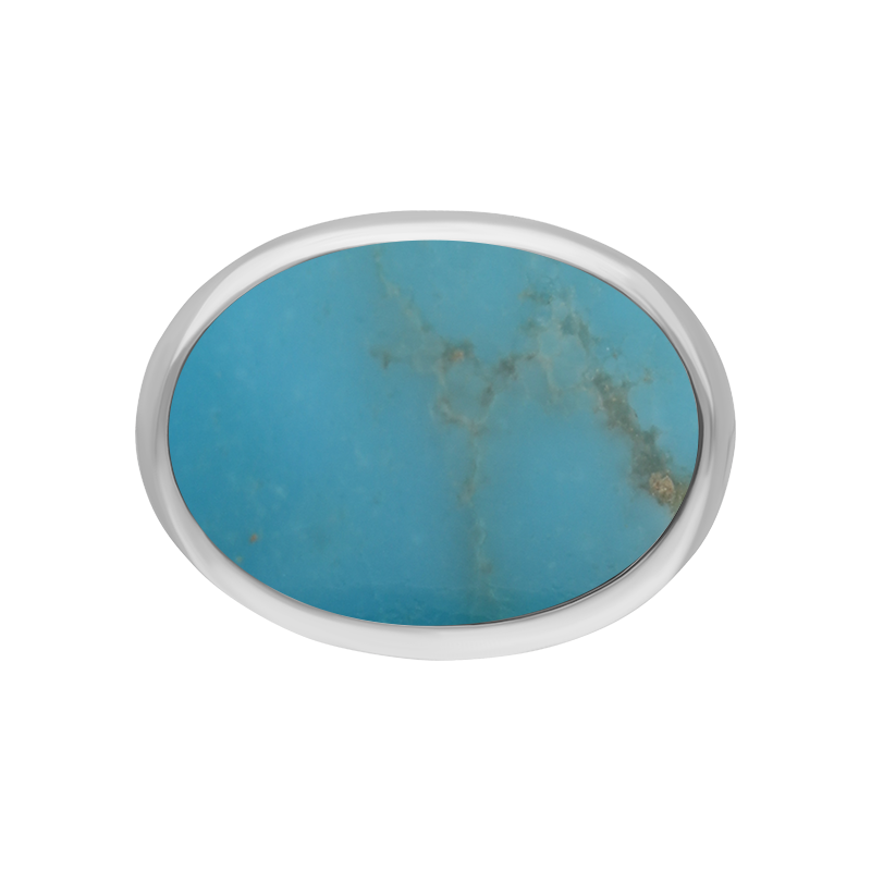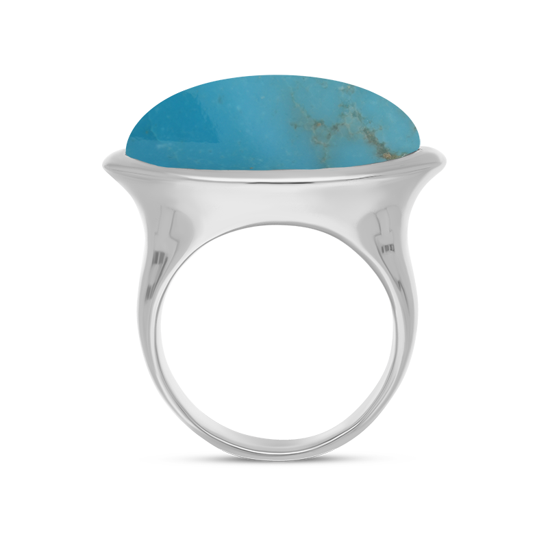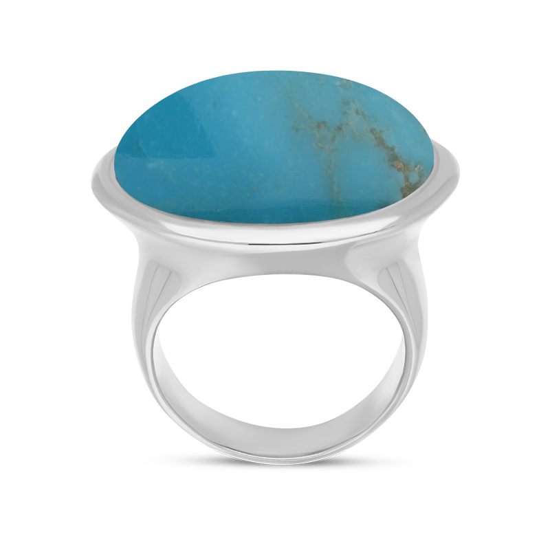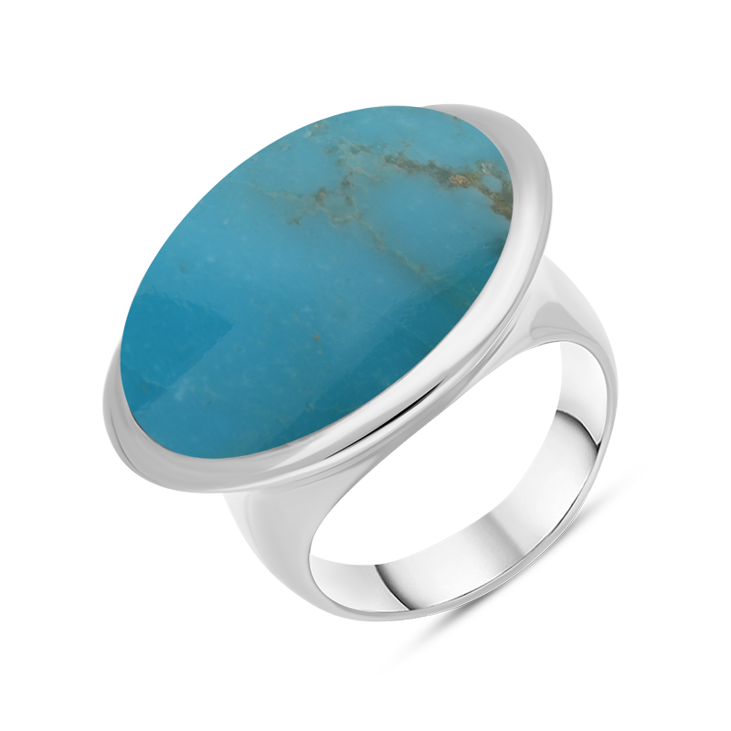 A classic, wide oval shaped sterling silver and Turquoise ring. The hand polished oval Turquoise gemstone sits proudly, making this ring a flattering shape for a multitude of fingers and a popular style choice. Dimensions: 24mm x 18mm.