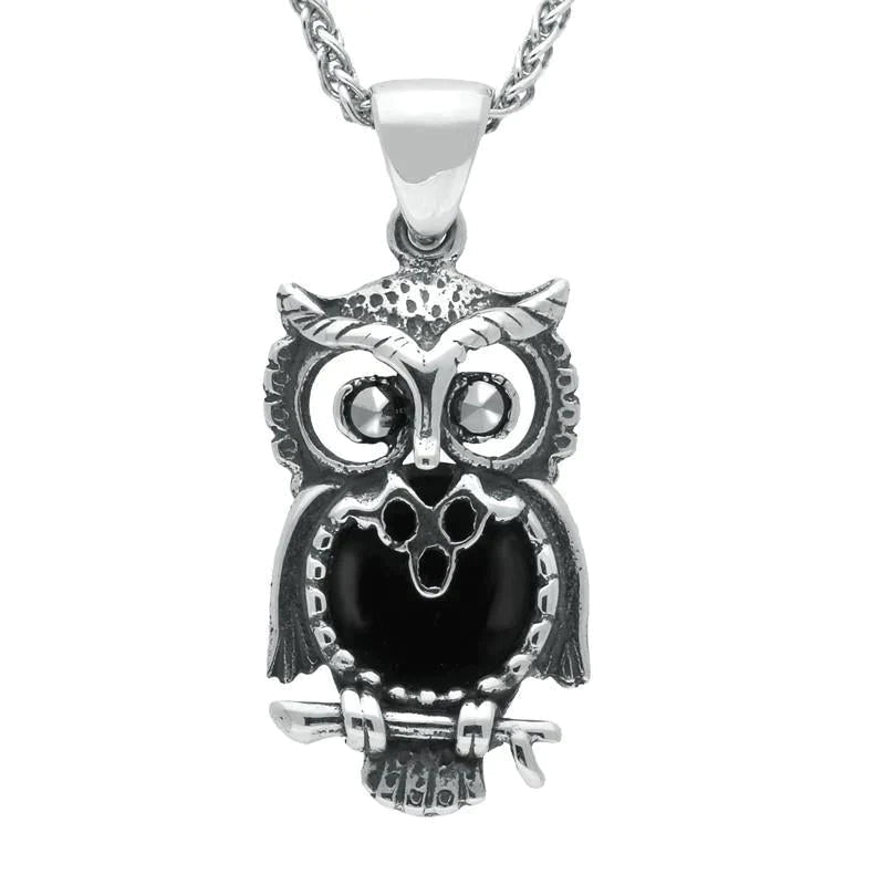 This charming owl pendant features a cabochon of the finest Whitby Jet stone which has been sourced directly from the North East coast of Yorkshire. The sterling silver owl design is further embellished by sparkling marcasite details. This pendant is completed with an 18 inch sterling silver chain which fastens with a classic bolt ring style clasp.