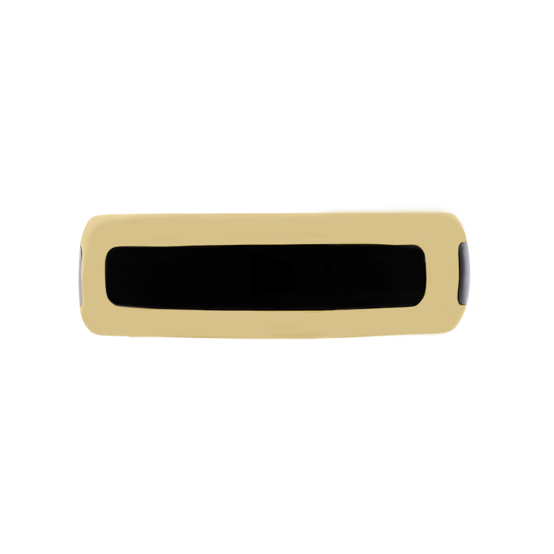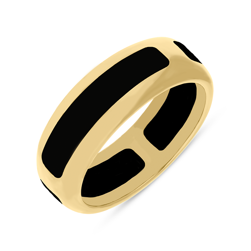 An embodiment of bold style, this stunning 9ct yellow gold ring features elongated rectangular cabochons of the finest Whitby Jet stone, sourced directly from the north east coast of Yorkshire. The striking Whitby Jet creates a stunning contrast between the 9ct yellow gold and makes this the perfect dress ring or wedding band for someone looking for a beautifully unique piece. The 8mm yellow gold band gives the ring a solid and substantial weight, meaning this piece can be treasured for generations to come.