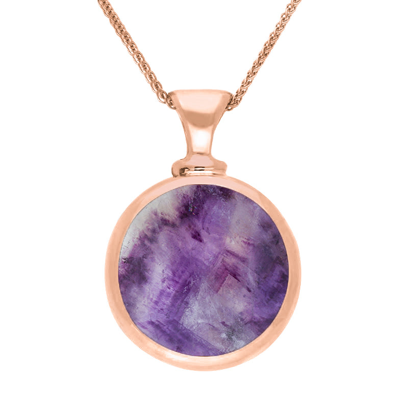 18ct Rose Gold Whitby Jet Blue John Double Sided Round Dinky Fob Necklace, P218.