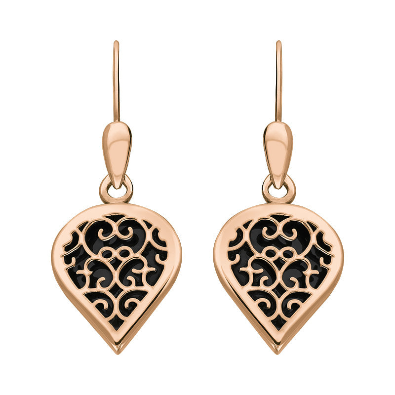 18ct Rose Gold Whitby Jet Flore Filigree Heart Drop Earrings. E2588.