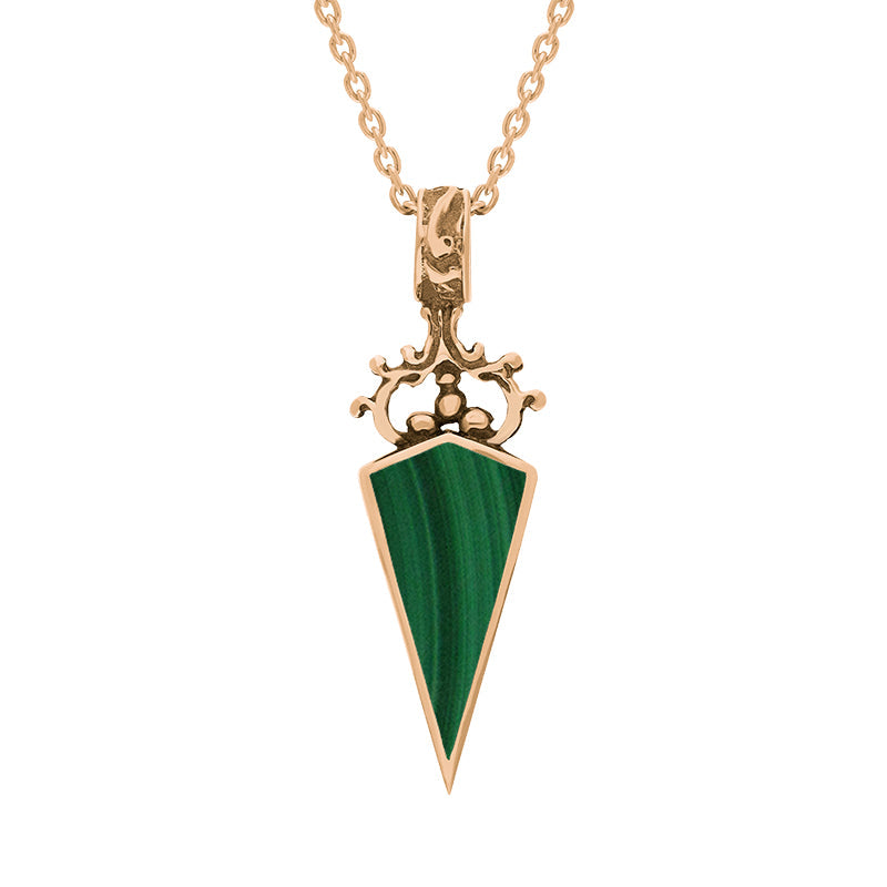 This classic double sided fob necklace is part of our Heritage handmade jewellery collection and features a dagger shaped locally sourced Whitby Jet gemstone on one side and a Malachite gemstone on the other. The stones are framed within a heavy highly polished 18ct Rose Gold setting with a scroll shaped bail. This item is complete with an 18 inch Rose Gold chain.