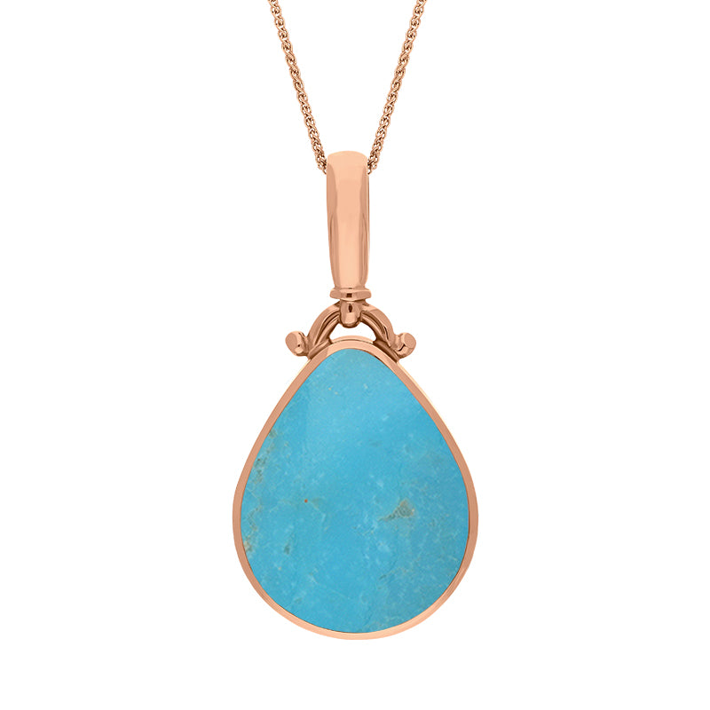 18ct Rose Gold Whitby Jet Turquoise Double Sided Pear Fob Necklace
