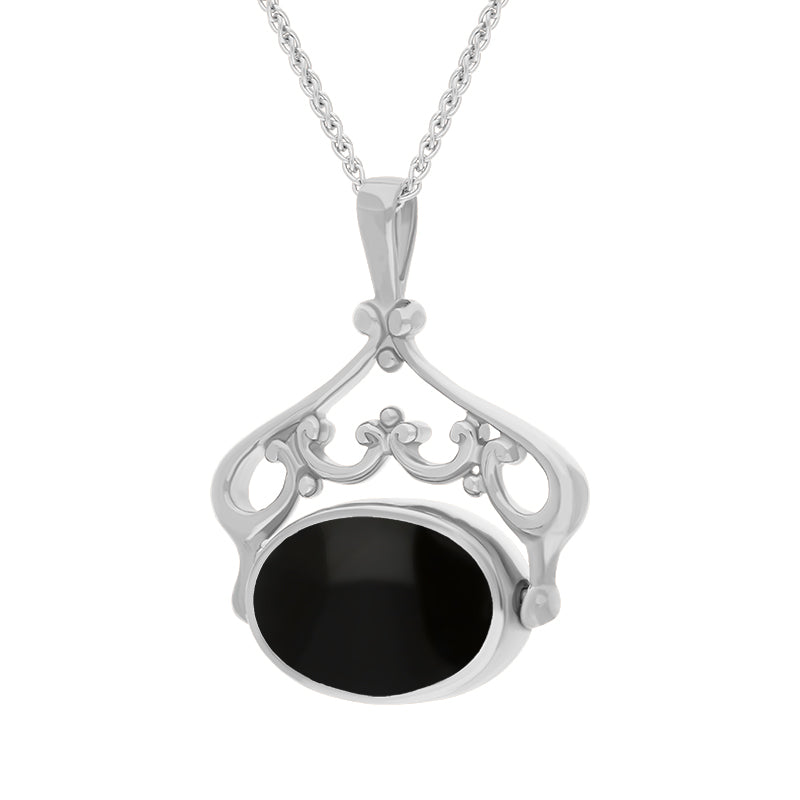 18ct White Gold Blue John Whitby Jet Ornate Double Sided Oval Swivel Fob Necklace, P116_8.