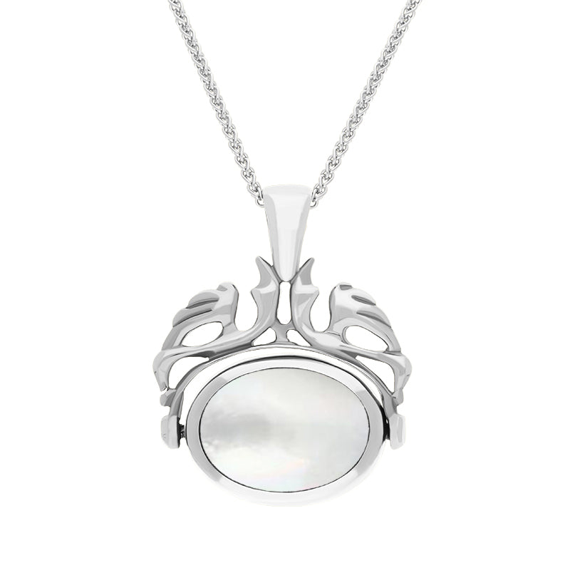 18ct White Gold Whitby Jet Mother Of Pearl Double Sided OvalSwivel Fob Necklace, P104_4.