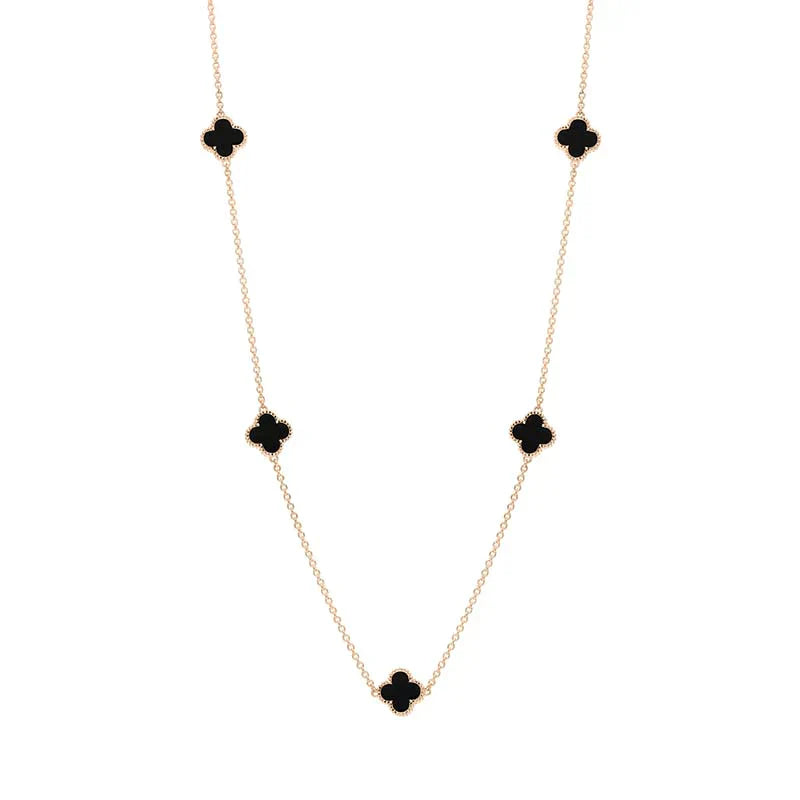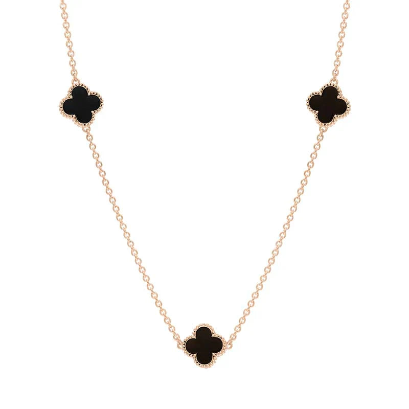 This elegant necklace features five stunning four leaf clover shaped cabochons of the finest Whitby Jet stone, sourced directly from the north east coast of Yorkshire. The clover stations are surrounded with a ball edge detail for a unique, stylish finish. The striking Whitby Jet forms a stunning contrast between the 9ct rose gold frames 18 inch chain, creating the perfect look for every occasion.